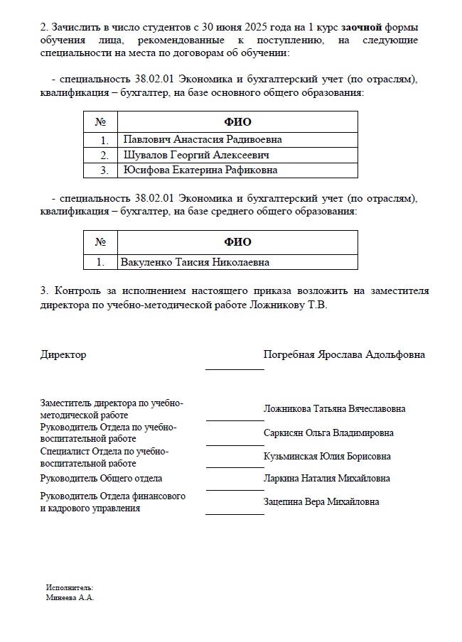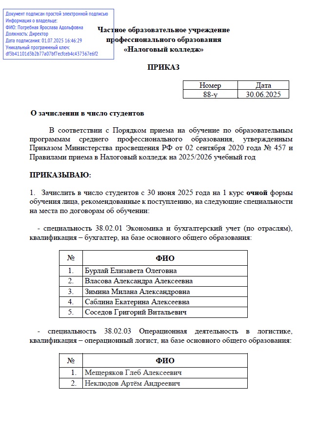 Приказ №88-у от 30.06.25 "О зачислении в число студентов"