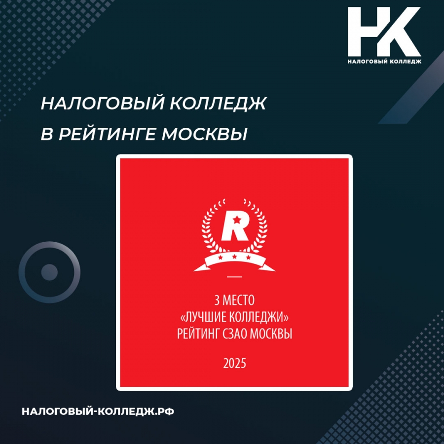 Налоговый колледж вошел в Рейтинг Москвы в категории "Колледжи", заняв 3-е место среди колледжей СЗАО Москвы.