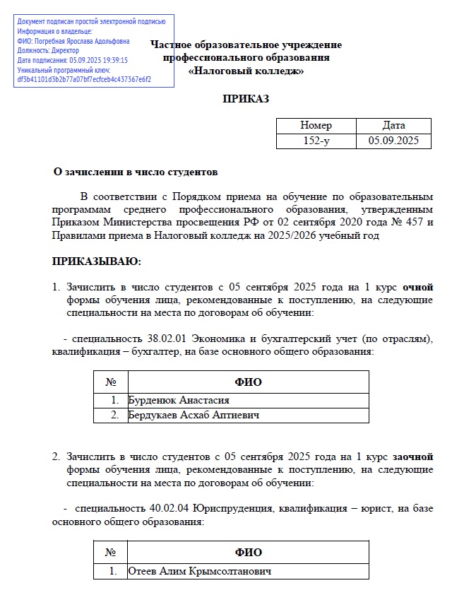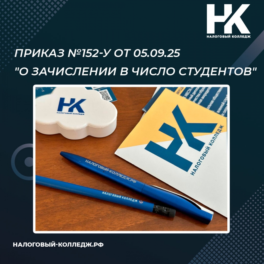 Приказ №152-у от 05.09.25 "О зачислении в число студентов"