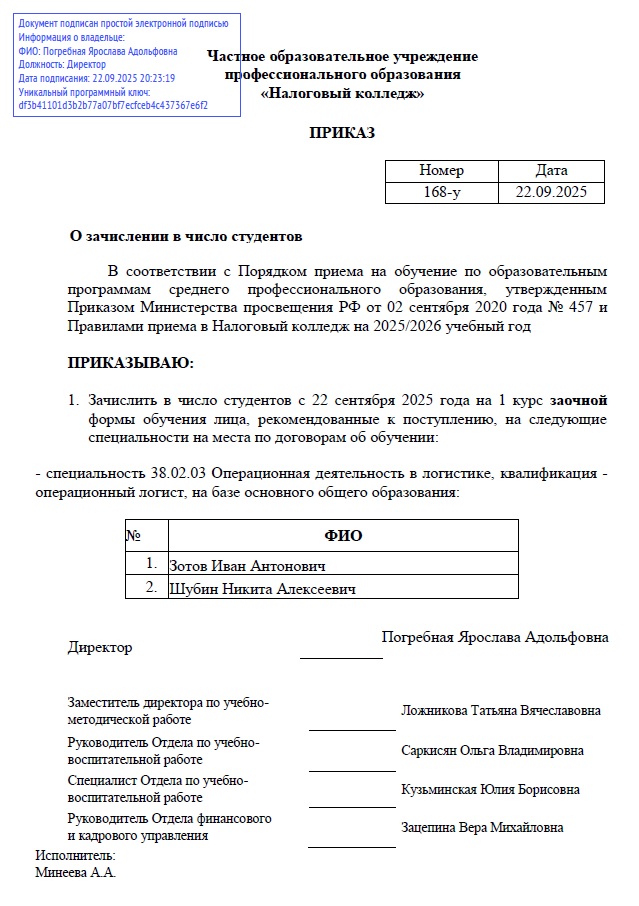 Приказ №168-у от 22.09.25 "О зачислении в число студентов"