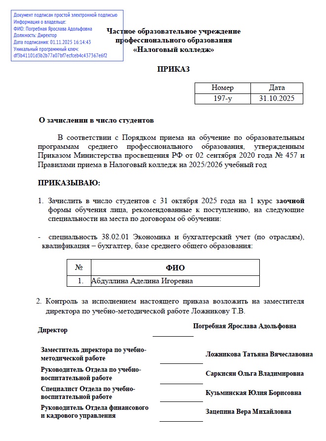 Приказ №197-у от 31.10.25 "О зачислении в число студентов"