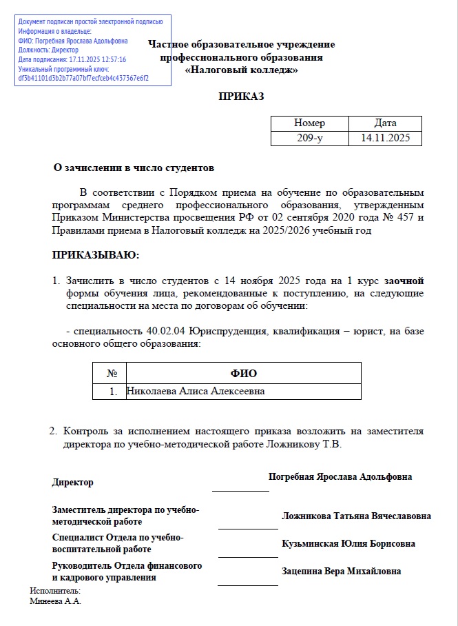 Приказ №209-у от 14.11.25 "О зачислении в число студентов"