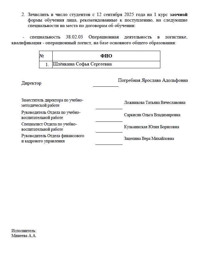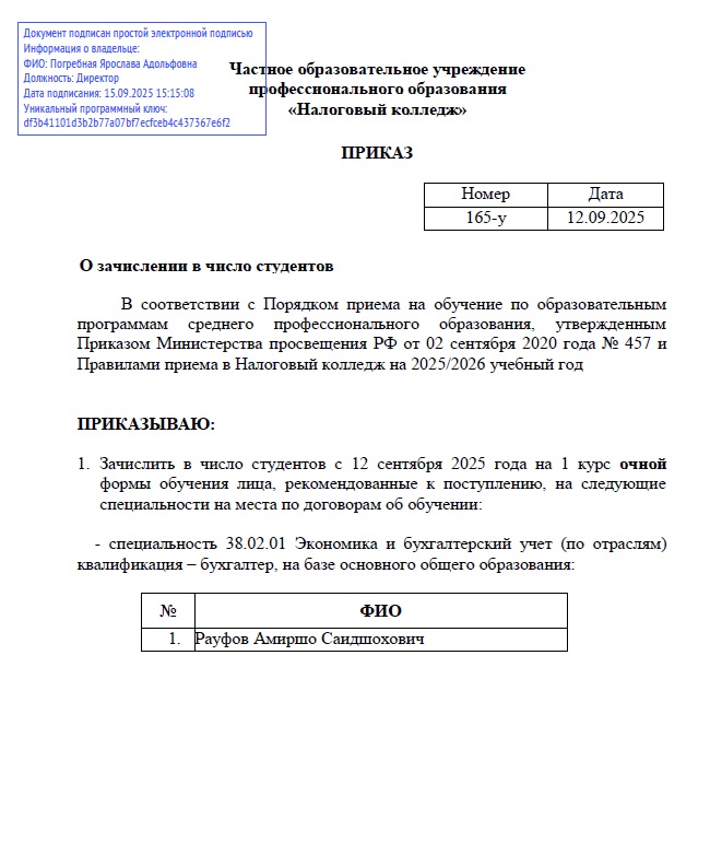 Приказ №165-у от 12.09.25 "О зачислении в число студентов"