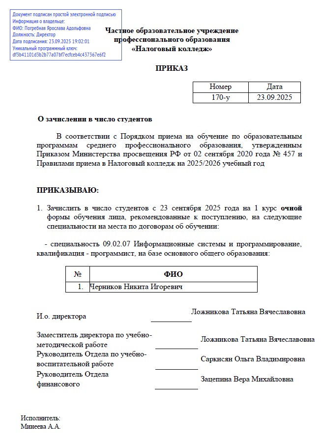 Приказ №170-у от 23.09.25 "О зачислении в число студентов"