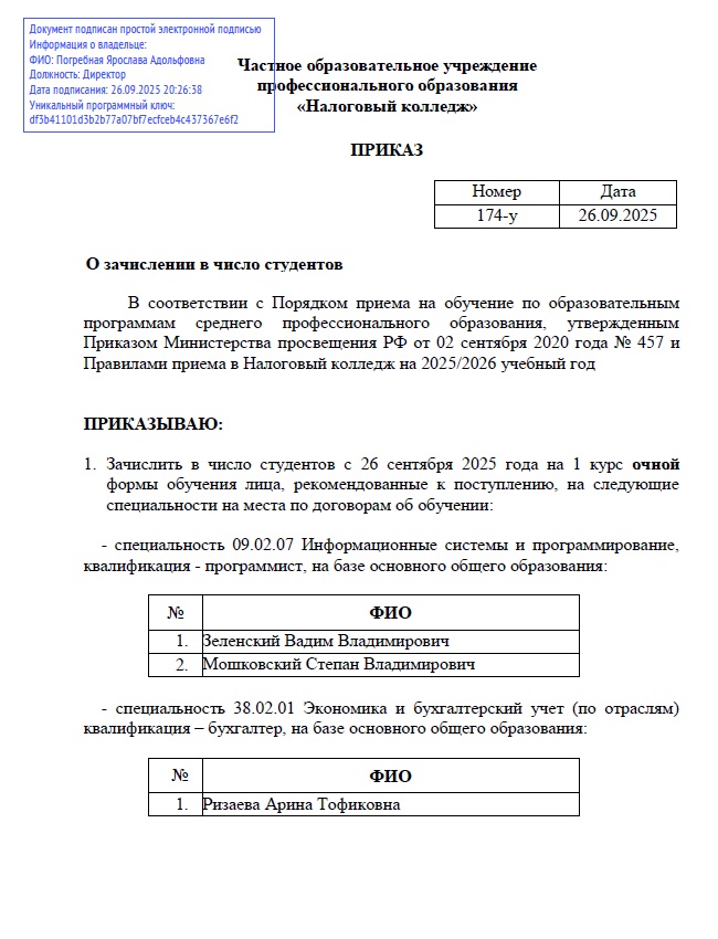 Приказ №174-у от 26.09.25 "О зачислении в число студентов"