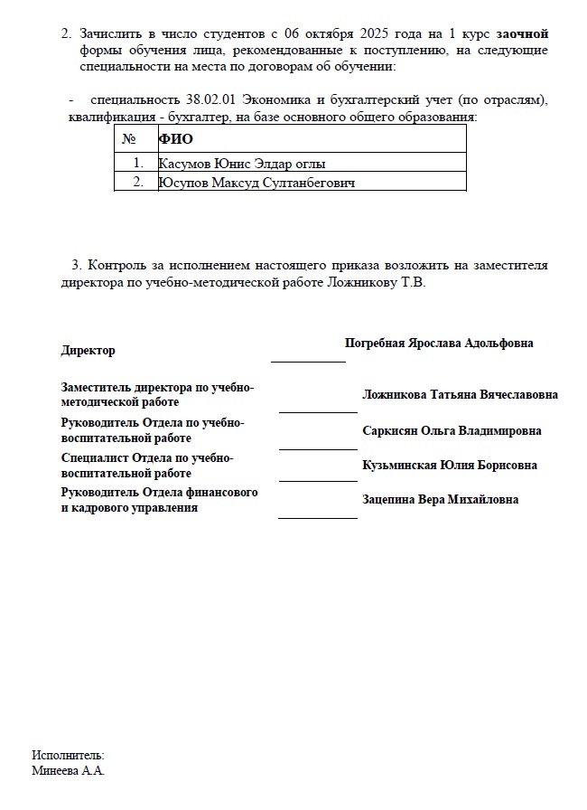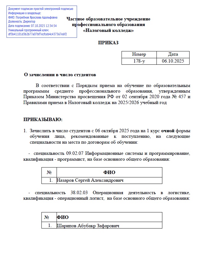 Приказ №178-у от 06.10.25 "О зачислении в число студентов"