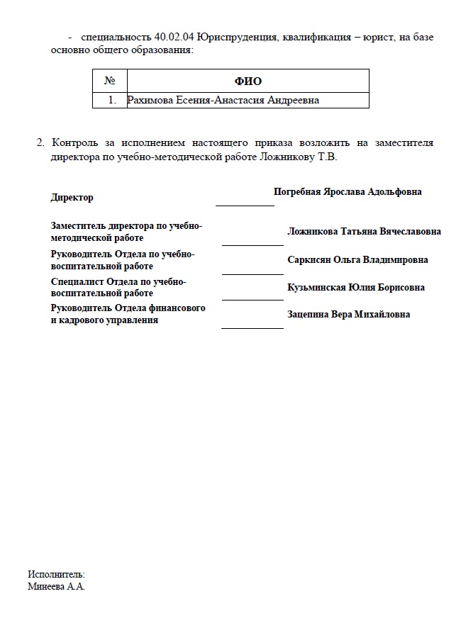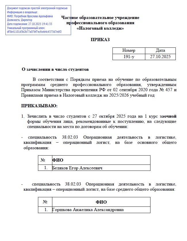 Приказ №191-у от 27.10.25 "О зачислении в число студентов"