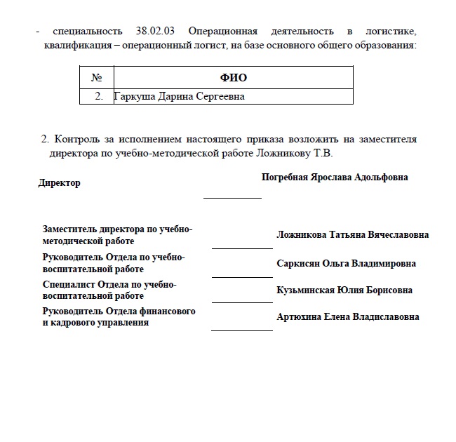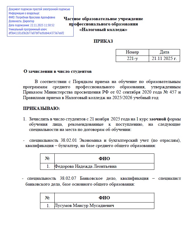 Приказ №221-у от 21.11.25 "О зачислении в число студентов"