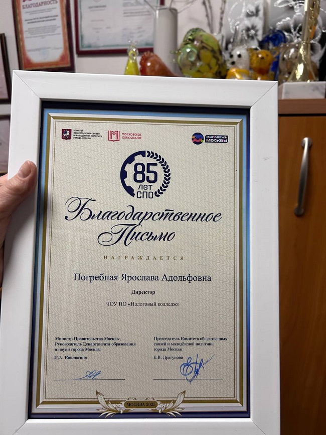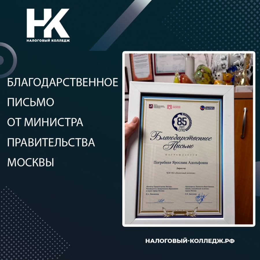 Осенью 2025 года директору Налогового колледжа кандидату педагогических наук Погребной Ярославе Адольфовне вручено Благодарственное письмо от Министра Правительства Москвы, Руководителя Департамента образования и науки города Москвы Каклюгиной И.А.